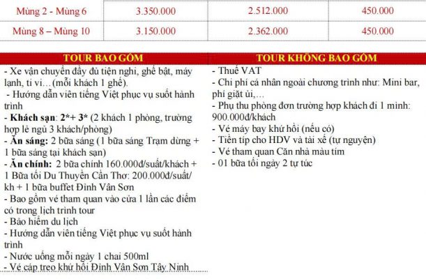 Khởi hành: Mùng 2,3,4,5,6,8,9,10